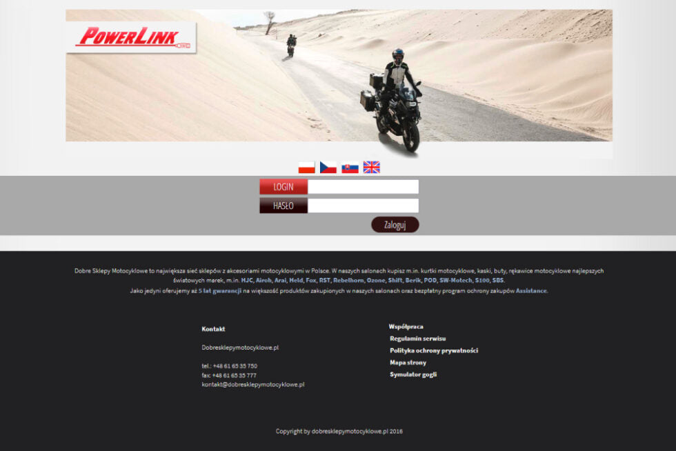 Współpracę z nami ułatwia napisany specjalnie dla potrzeb branży rowerowej system obsługi klienta biznesowego –Powerlink.To rozwiązanie B2B pozwala szybko i sprawnie realizować zamówienia. W panelu klienta widzisz wszystkie nowości i promocje, dzięki specjalnym boksom informacyjnym – nie przegapisz zatem żadnej korzystnej oferty. Masz też podgląd nie tylko w bieżące zamówienia, ale też widzisz całą historię, dzięki czemu wiesz, co i kiedy zamówiłeś. Możesz też pobrać wszystkie potrzebne materiały promocyjne – logotypy, zdjęcia produktowe i wizerunkowe, a nawet bannery do sklepów online.